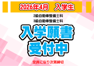 令和8年4月入学生 10月1日より入学願書受付中! 2025 10/08 お知らせ 10月1日より、令和8年度4月入学生の入学願書受付を開始致します。入学試験の詳細は、各学科の募集要項をご覧下さい。皆様のご出願を心よりお待ちしております。 高校3年生および高校卒業以上の方 専門課程職業実践専門課程 2級自動車整備士科高校卒業以上で入学可能【2年制】 募集要項を詳しく見る 中学3年生および中学校卒業以上の方 高等課程科学技術学園高等学校連携 3級自動車整備士科中学校卒業以上で入学可能【3年制】 募集要項を詳しく見る お知らせ この記事が気に入ったら フォローしてね! Follow @akamon_atc Follow Me よかったらシェアしてね! URLをコピーしました! URLをコピーしました!