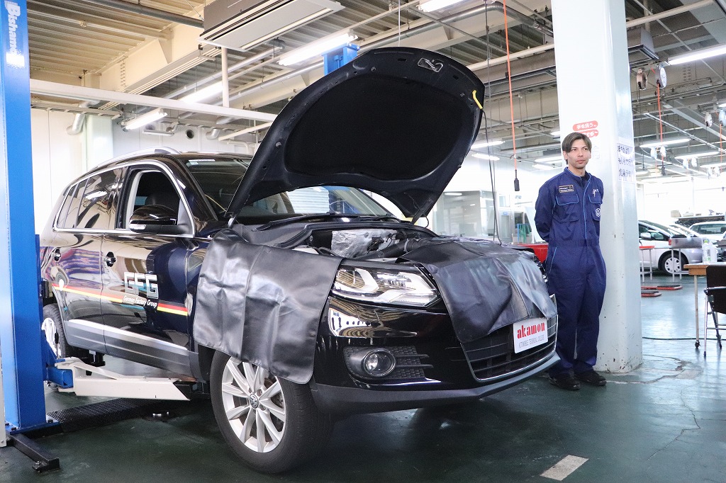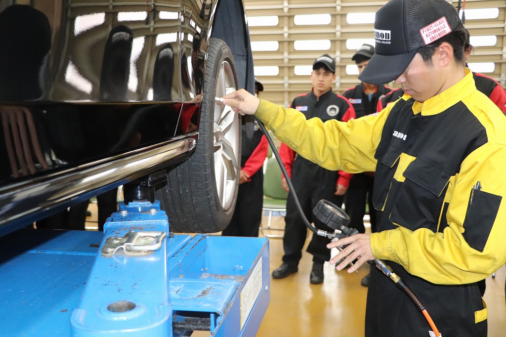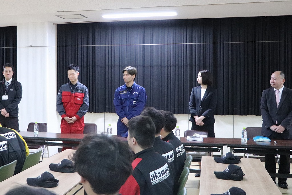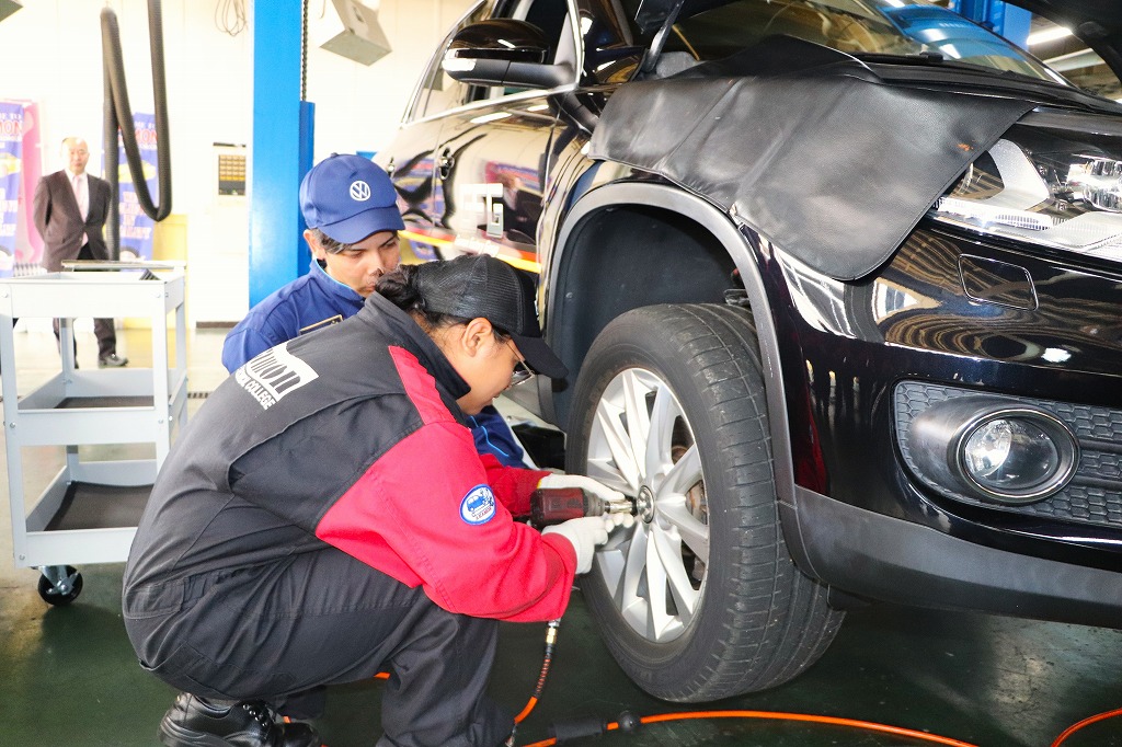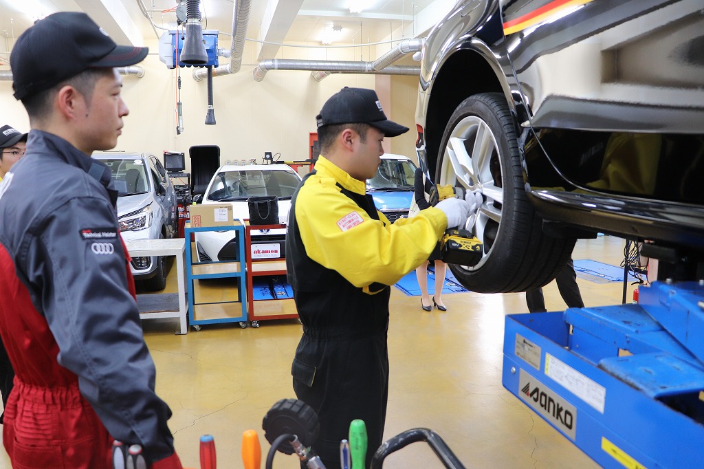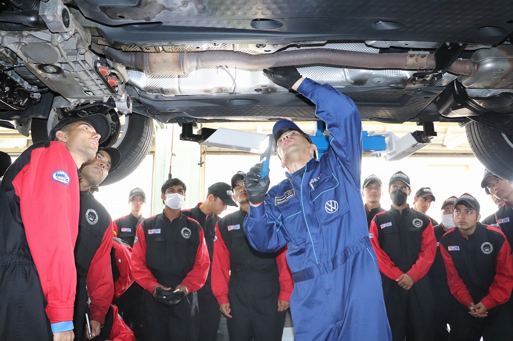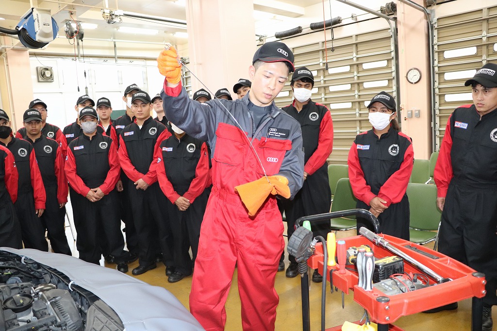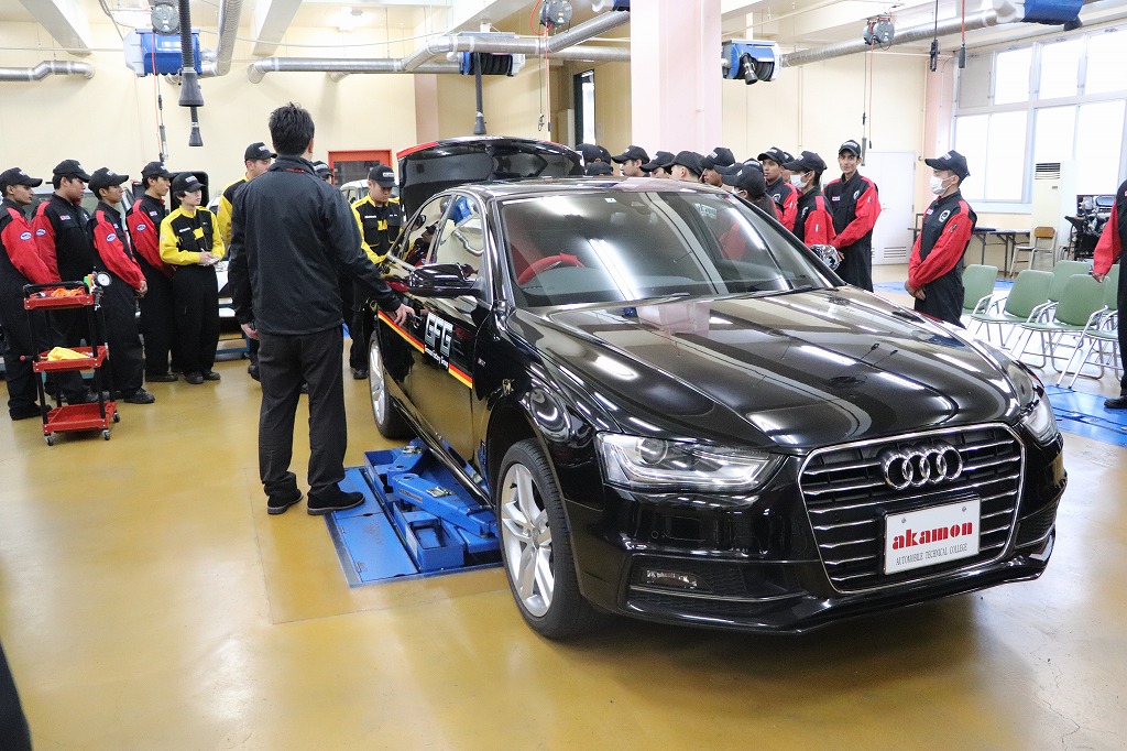 実習ではジャーマン・ファクトリー・グループ様から寄贈頂いた、アウディ及びフォルクスワーゲンを使用し、現場で活躍されているメカニックの方から整備の基本となる「1年点検」及び「60項目指定点検」について指導して頂きました。