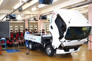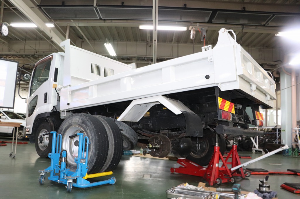 実習授業では、いすゞ・フォワードを使用した、ハブベアリングのプレロード調整を学びました。重量のあるトラックを安全かつスムーズに動かすための非常に重要な技術となります。学生達も、普通車とは違うパーツの重量感などを肌で感じながら取り組んでいました。