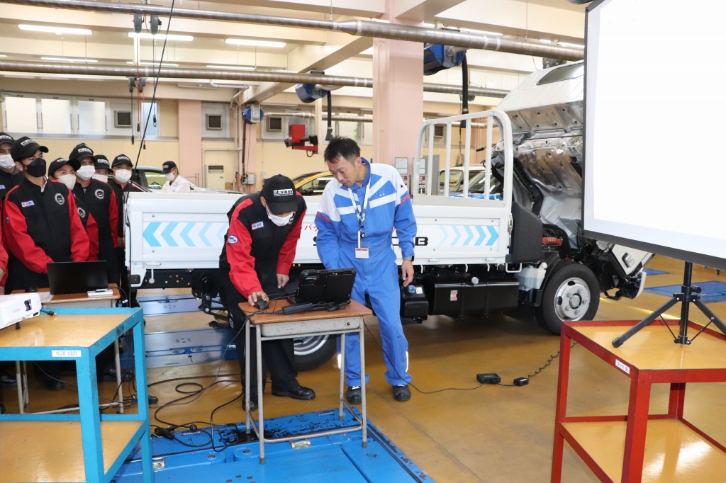 また、いすゞ・エルフを使用した診断機による故障診断の実習も行って頂きました。データに基づいた効率的で正確な整備を可能にする最新技術に触れ、学生達も大きな刺激になったのではないかと思います。