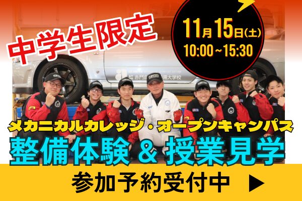 中学校卒業以上で入学できる3級自動車整備士科対象の整備体験&授業見学会です。